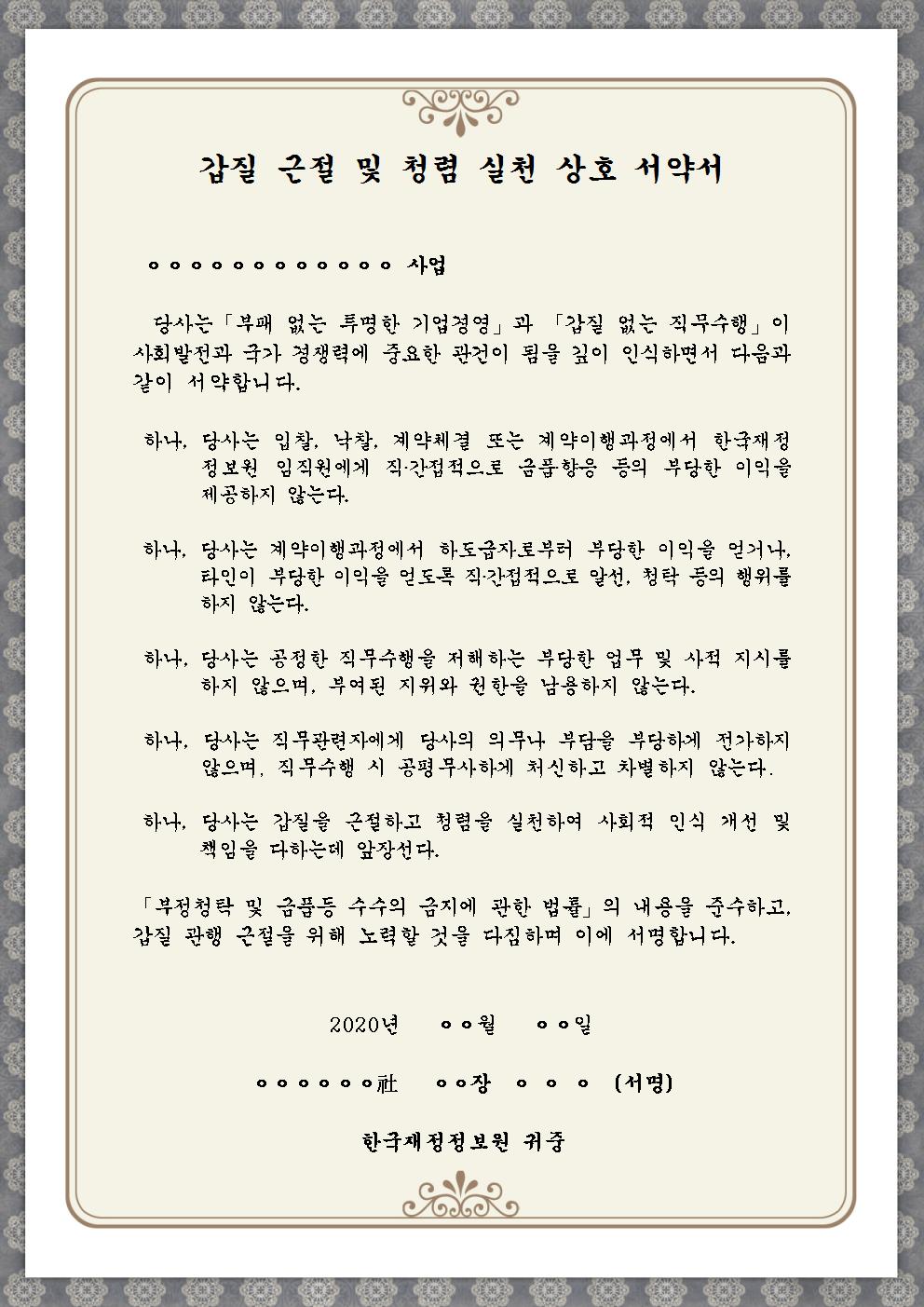 한국재정정보원에서는 사업수행 간 갑질·부정당행위를 근절하고 공정거래 확립을 위해 갑질 근절 및 청렴 실천 상호 서약서를 다음과 같이 시행하였습니다. □ 목적 : 업수행 간 갑질·부정당행위를 근절하고 공정거래 확립을 위해 갑질 근절 및 청렴 실천을 다짐하는 상호 서약서 작성