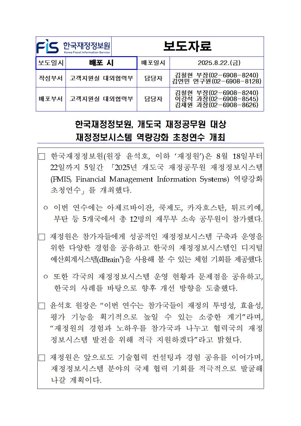 [보도자료] 한국재정정보원, 개도국 재정공무원 대상 재정정보시스템 역량강화 초청연수 개최.hwp