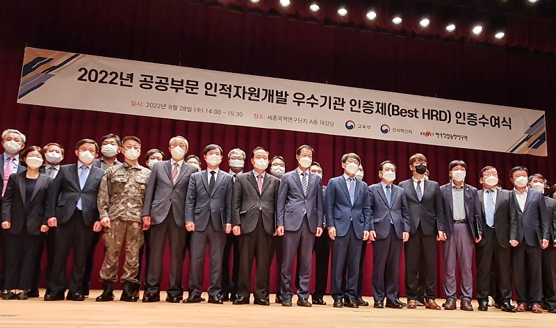 한국재정정보원(원장 박용주)은 9월 28일, 교육부에서 총괄하고 한국직업능력개발원에서 주관하는 '2022년 공공부문 인적자원개발 우수시관 인증제(Best HRD, Best Human Resources Developer)'에서 우수기관 인증을 획득하였다. |