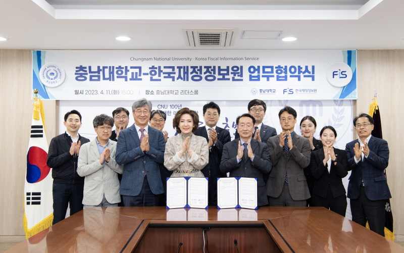 한국재정정보원(원장 박용주, 이하 ‘재정원’)은 4월 11일(화), 충남대학교(총장 이진숙, 이하 ‘충남대’)와 「대전․세종․충청 지역인재 육성」을 위한 업무협약(MOU)을 충남대학교 리더스룸에서 체결했다. |