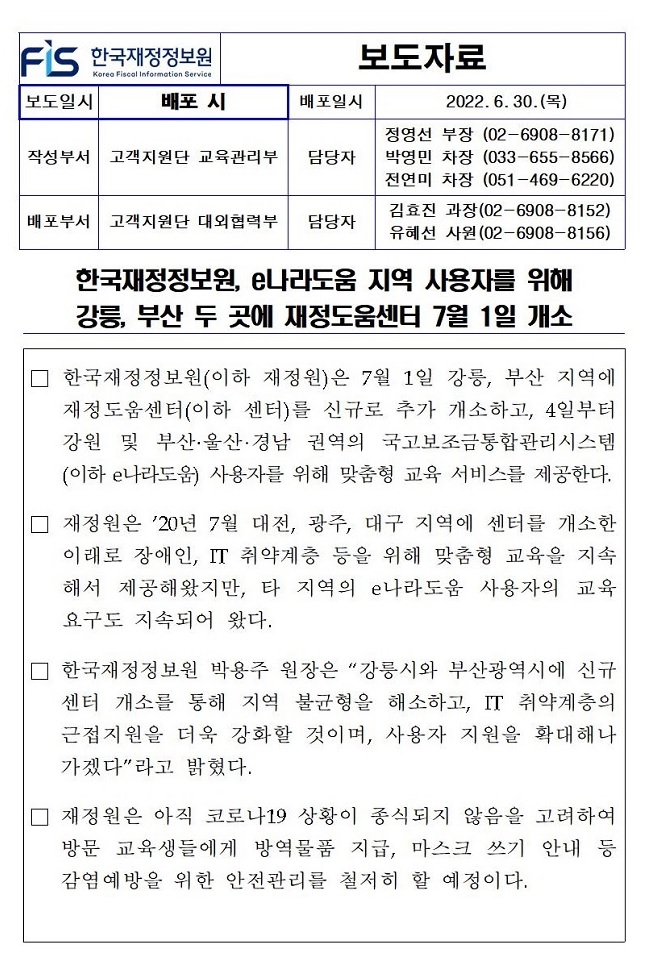 [보도자료] 한국재정정보원, e나라도움 지역 사용자를 위해 강릉, 부산 재정도움센터 개소.hwp