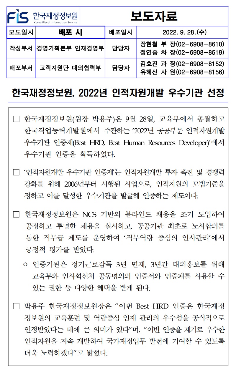 [보도자료] 한국재정정보원, 2022년 인적자원개발 우수기관 선정.hwp