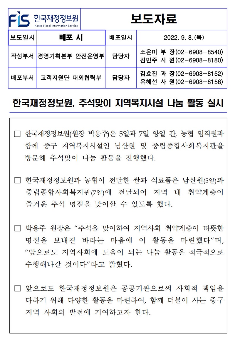 [보도자료] 한국재정정보원, 추석맞이 지역복지시설 나눔 활동 실시.hwp