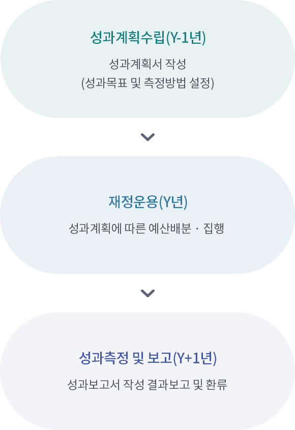 - 성과보고서: 다음 연도(Y+1)에 해당 연도(Y)의 사업실적을 토대로 성과목표의 달성여부, 미흡원인 등을 분석·보고