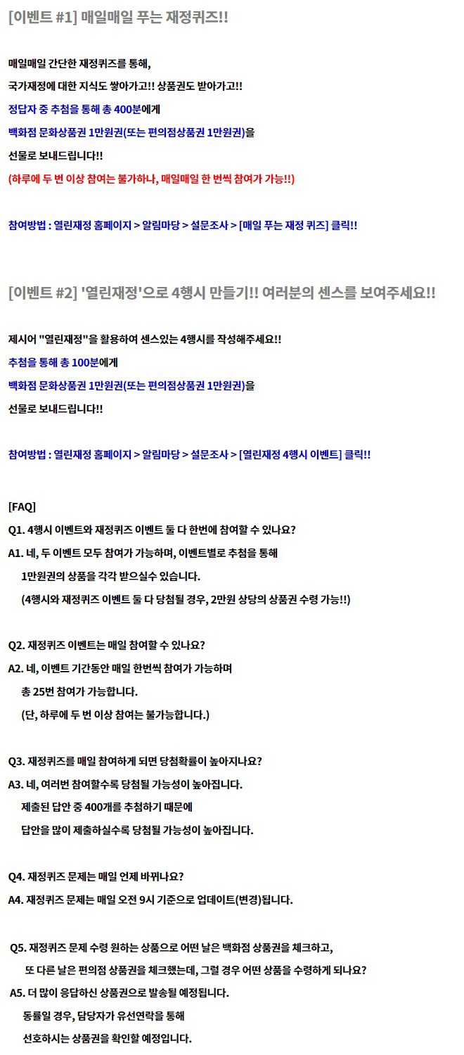 [이벤트#1] 매일매일 푸는 재정퀴즈!! 매일매일 간단한 재정퀴즈를 통해 국가재정에 대한 지식도 쌓아가고!! 상품권도 받아가고!! [이벤트#2]'열린재정'으로 4행시 만들기!! 여러분의 센스를 보여주세요!! |