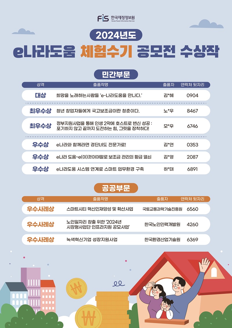 2024년 e나라도움 체험수기 공모전 결과를 발표합니다. 공모전에 참여해 주신 모든 분께 감사의 말씀드립니다. [수상자 안내] 수상자 및 수상기관 총 38명 - 민간부문 대상(1명) 김*혜(0904) - 민간부문 최우수상(2명) 노*우(8467), 모*우(6746) - 민간부문 우수상(3명) 김*연(0353), 김*영(2087), 하*태(6891) - 공공부문 우수사례상(3개 기관) 국토교통과학기술진흥원(6560), 한국노인인력개발원(4260), 한국환경산업기술원(6369) - 장려상(29명) 강*경(2534), 강*늘(6904), 강*미(8254), 강*지(7225), 권*민(6630), 김*민(0033), 김*아(1993), 김*완(2154), 김*원(5049), 김*원(9734), 김*태(1770), 문*랑(1992), 박*린(7125), 박*영(9349), 배*민(9654), 배*봉(6706), 서*수(9794), 송*석(9036), 신*은(4300), 신*화(3353), 오*권(4805), 오*정(2379), 윤*진(9193), 이*미(0065), 이*삼(2192), 이*하(9353), 이*형(6324), 장*기(7942), 전*준(3671) 수상자분들께는 개별적으로 연락드릴 예정이며, 경품 발송은 12월 19일(목) 이후 순차적으로 진행될 예정입니다. |