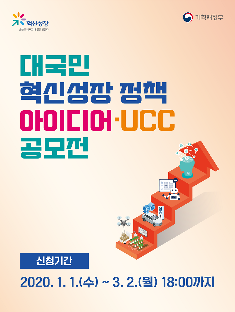 안녕하십니까 기획재정부에서는 혁신성장 확산 및 가속화를 위한 새로운 정책과제 발굴 및 그간 추진해온 혁신성장 정책에 대한 국민 이해도와 체감도 제고를 위해 아래와 같이 “대국민 혁신성장 정책아이디어·UCC공모전”을 진행할 예정입니다. 여러분의 많은 협조부탁드립니다. ㅇ 공모전 홈페이지 주소 및 배너: www.inno-idea.com ㅇ 기간: 2020. 1. 1.(수) ~ 3. 2.(월)