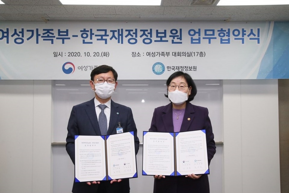 ㅁ 여성가족부와 한국재정정보원이 20일「청소년을 위한 재정역량 성장협」을 맺었다. 청소년들에게 국가재정활동에 대한 배움·체험 기회를 제공함으로써 미래세대의 재정이해도와 재정책임성을 향상시키자는 취지다. ㅁ 이를 위해 재정정보원은 △청소년특별회의 △꿈드림센터 △국립청소년수련원 △방과후 아카데미 등 여성가족부 소관 청소년 프로그램에 재정배움 콘텐츠를 제공하고, 이를 프로그램의 지도자 대상 직무교육을 지원하기로 했다. ㅇ 또 청소년들이 스스로 정책을 발굴해 정부에 제안하는 청소년 특별회의와 국민참여예산제의 연계방안을 모색함으로써, 청소년들이 제안한 정책이 정부 예산안에 적극 반영되도록 노력하기로 했다. ㅇ 청소년박람회, 국제교류 등의 청소년행사에 재정배움 콘텐츠 부스 설치나 체험기회 제공 등의 협력사업도 펼치기로 했다. ㅁ 김재훈 재정정보원 원장은 이날 협약식에서 "최근 재난지원금 지급, 무상교육 확대 등으로 국가재정에 대한 청소년의 관심이 크게 높아진 시기에 여성가족부와 함께 재정배움 기회를 제공할 수 있어 뜻깊다."라고 말했다. ㅇ 이정옥 여성가족부 장관도 "이번 협약이 청소년들이 우리 공동체의 살림살이에 대한 이해를 바탕으로 국가예산에 참여할 수 있는 재정역량을 갖추어 미래사회의 균형 있는 시민으로 성장할 수 있는 바탕이 되기를 기대한다"라고 밝혔다. - 김재훈 재정정보원 원장과 이정옥 여성가족부 장관이 협약서에 서명을 하고 있다.