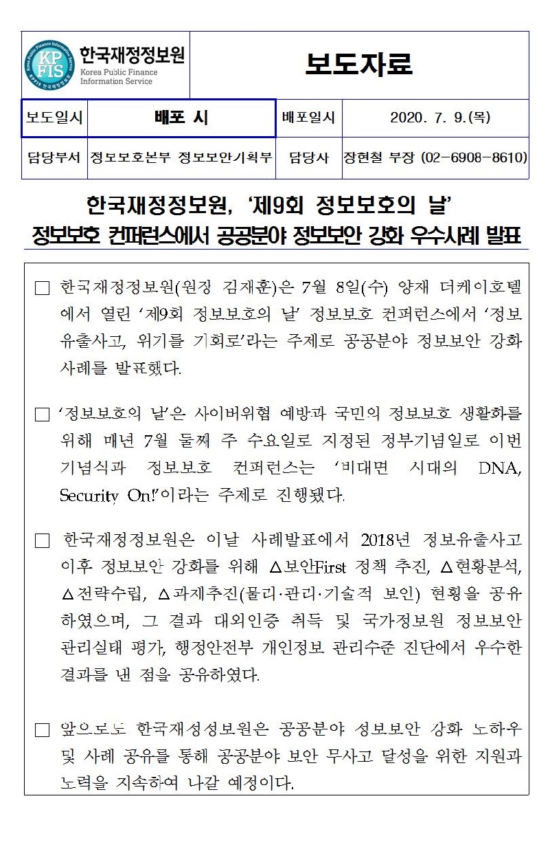 [보도자료] 한국재정정보원, 제9회 정보보호의 날 공공분야 정보보안 강화 우수사례 발표.hwp