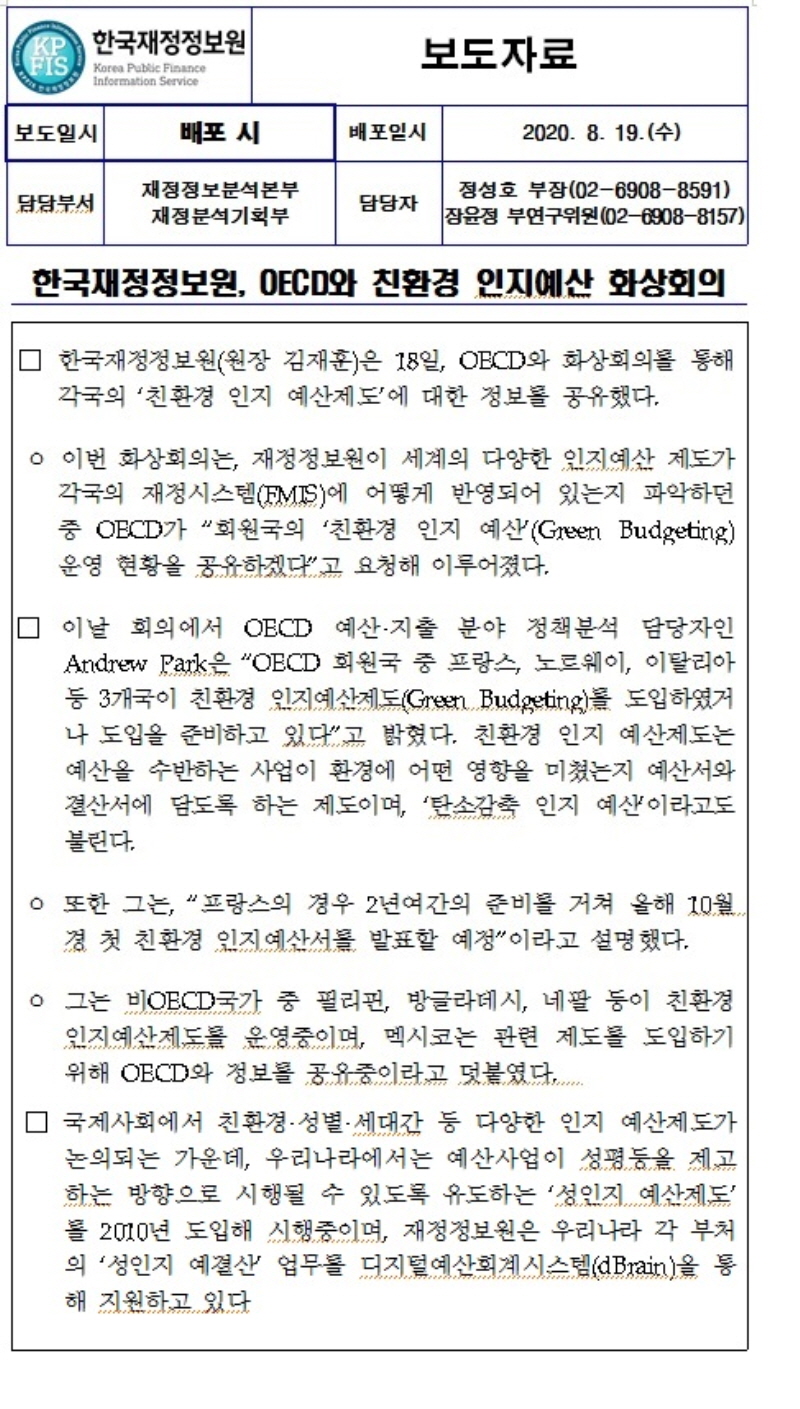 | 제목 | 한국재정정보원, OECD와 친환경 인지예산 화상회의 | ||||