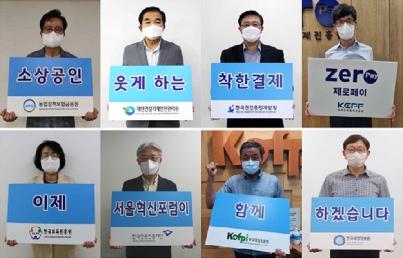 김재훈 한국재정정보원 원장(아랫줄 왼쪽에서 첫번째)과 서울혁신포럼 소속 7개 공공기관 관계자들이 기업제로페이 활성화를 위한 업무협약 후 기념촬영을 하고 있다. |