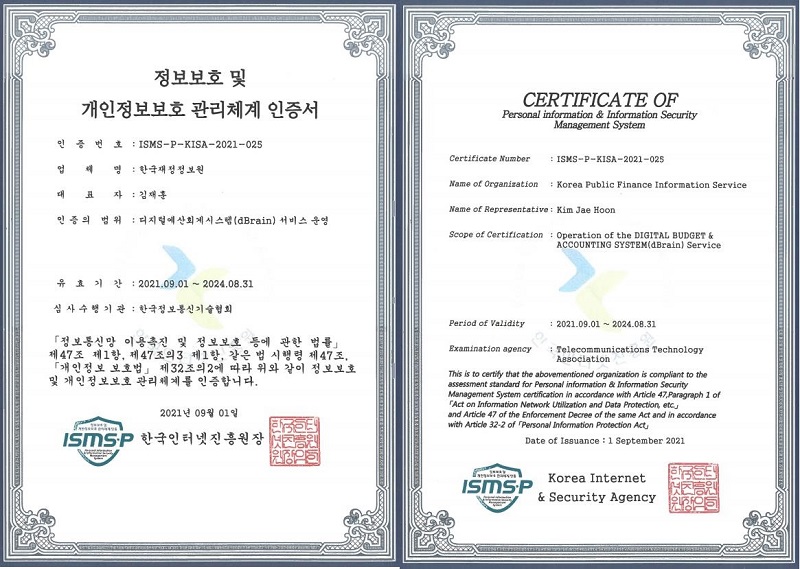 | 제목 | 디지털예산회계시스템(dBrain) 정보보호 및 개인정보보호 관리체계(ISMS-P) 인증 획득 | ||||
