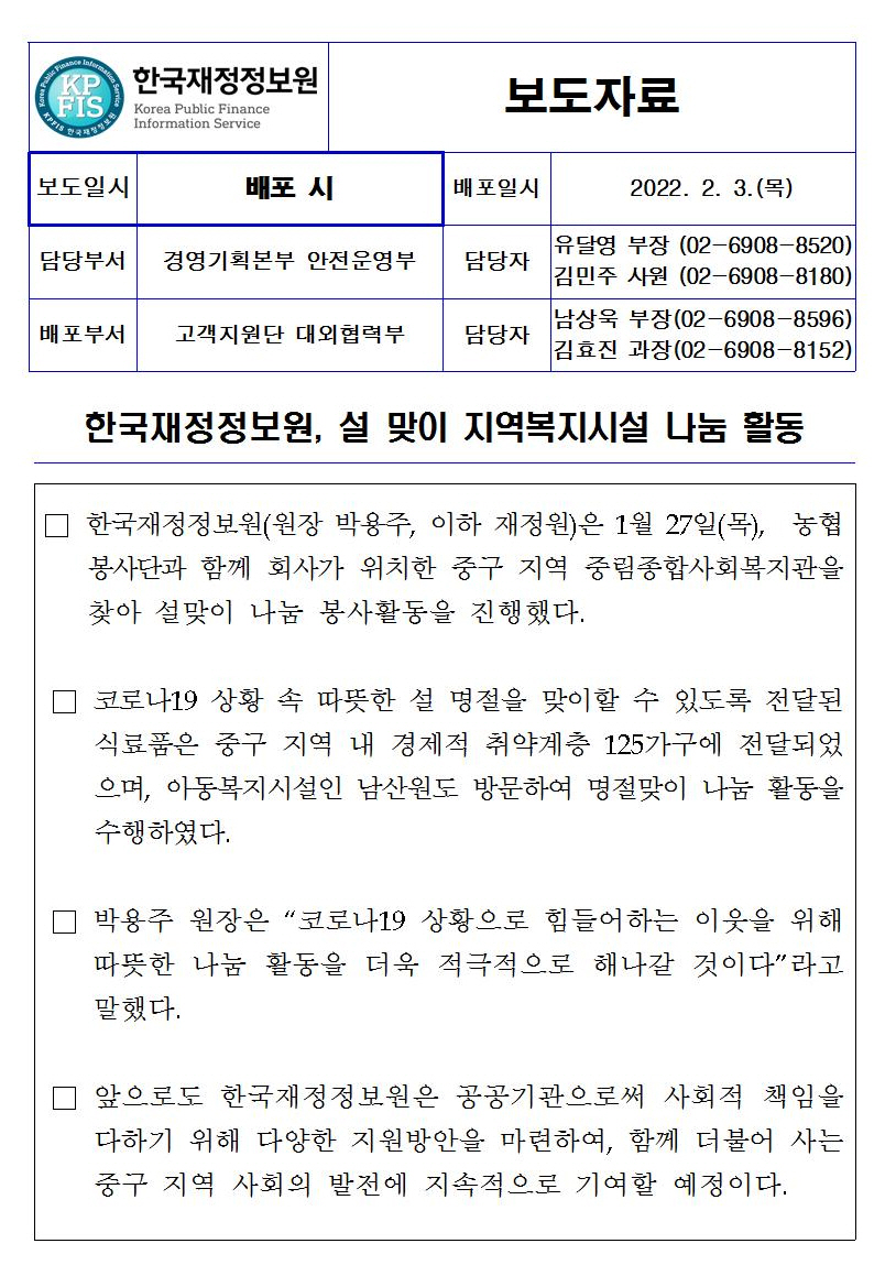 [보도자료] 한국재정정보원, 설 맞이 지역복지시설 나눔 활동.hwp