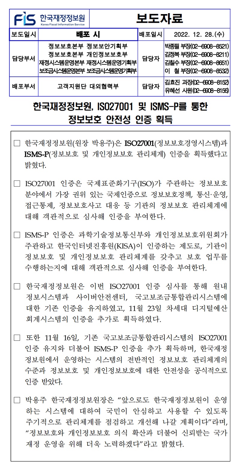 [보도자료] 한국재정정보원 ISO27001, ISMS-P 인증 획득.hwp