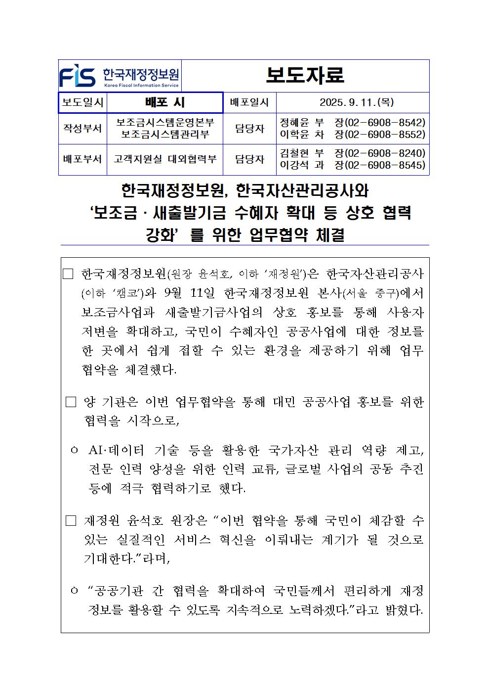 한국재정정보원, 한국자산관리공사와 ‘보조금·새출발기금 수혜자 확대 등 상호 협력 강화’를 위한 업무협약 체결□ 한국재정정보원(원장 윤석호, 이하 ‘재정원’)은 한국자산관리공사(이하 ‘캠코’)와 9월 11일 한국재정정보원 본사(서울 중구)에서 보조금사업과 새출발기금사업의 상호 홍보를 통해 사용자 저변을 확대하고, 국민이 수혜자인 공공사업에 대한 정보를 한 곳에서 쉽게 접할 수 있는 환경을 제공하기 위해 업무협약을 체결했다. □ 양 기관은 이번 업무협약을 통해 대민 공공사업 홍보를 위한 협력을 시작으로, ㅇ AI·데이터 기술 등을 활용한 국가자산 관리 역량 제고, 전문 인력 양성을 위한 인력 교류, 글로벌 사업의 공동 추진 등에 적극 협력하기로 했다. □ 재정원 윤석호 원장은 “이번 협약을 통해 국민이 체감할 수 있는 실질적인 서비스 혁신을 이뤄내는 계기가 될 것으로 기대한다.”라며, ㅇ “공공기관 간 협력을 확대하여 국민들께서 편리하게 재정정보를 활용할 수 있도록 지속적으로 노력하겠다.”라고 밝혔다.